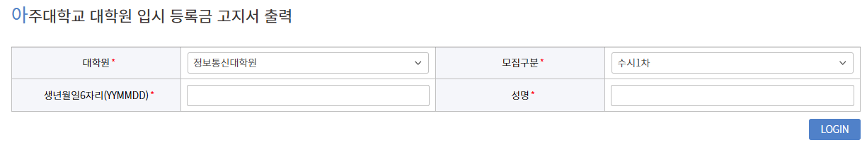 ※ 대학원-정보통신대학원, 모집구분-수시1차 선택 후 생년월일 6자리와 성명 입력 후 LOGIN 버튼 클릭