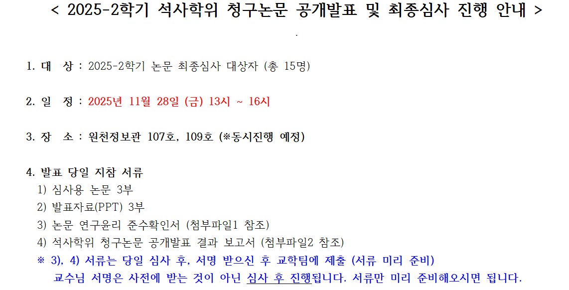 2025-2학기 석사학위 청구논문 공개발표 및 최종심사 진행 안내