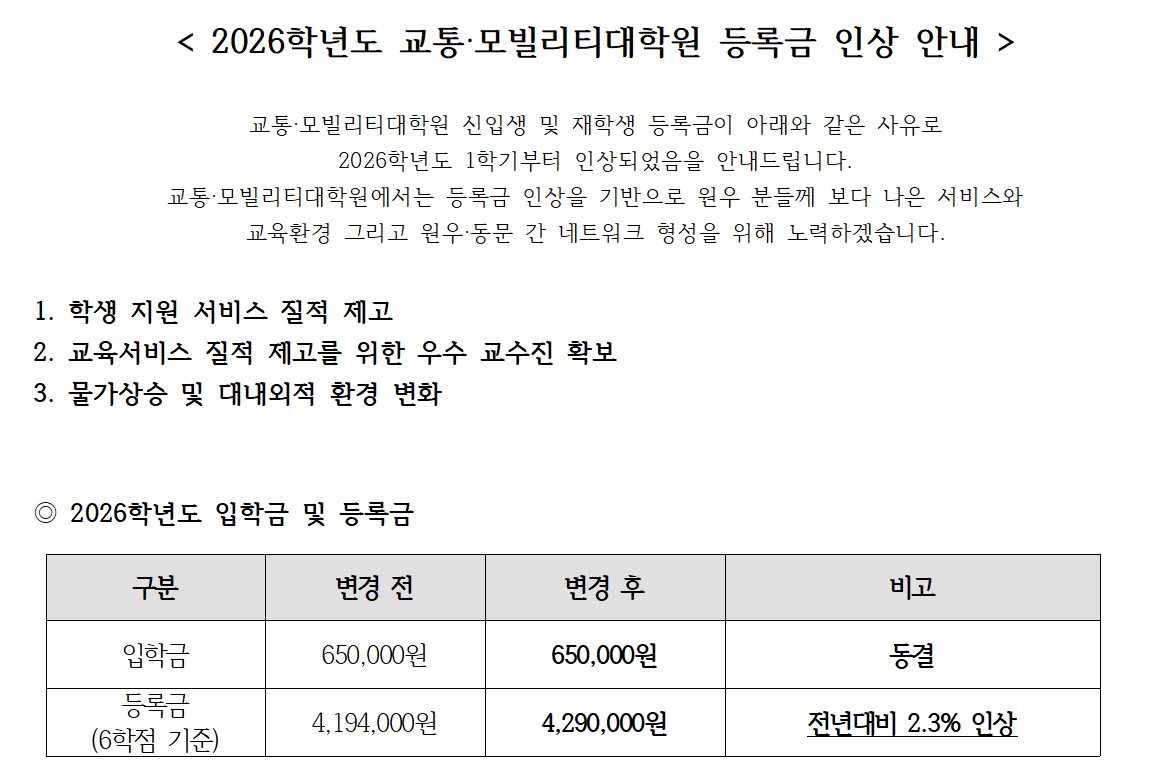 2026학년도 교통·모빌리티대학원 등록금 인상 안내