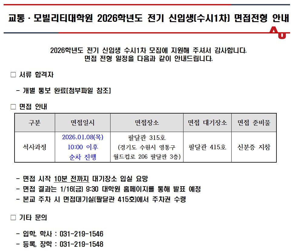 2026학년도 전기 신입생 수시1차모집 면접전형 안내