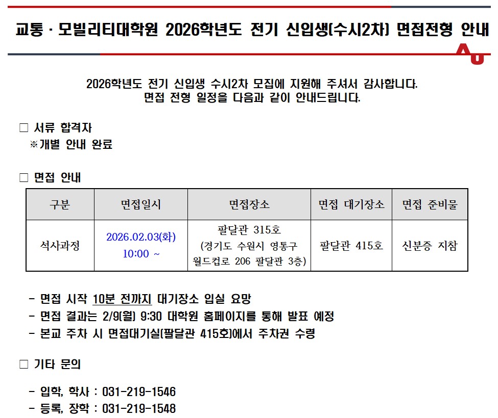 2026학년도 전기 신입생 수시2차모집 면접전형 안내