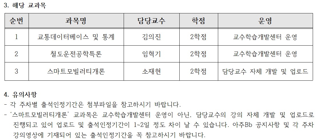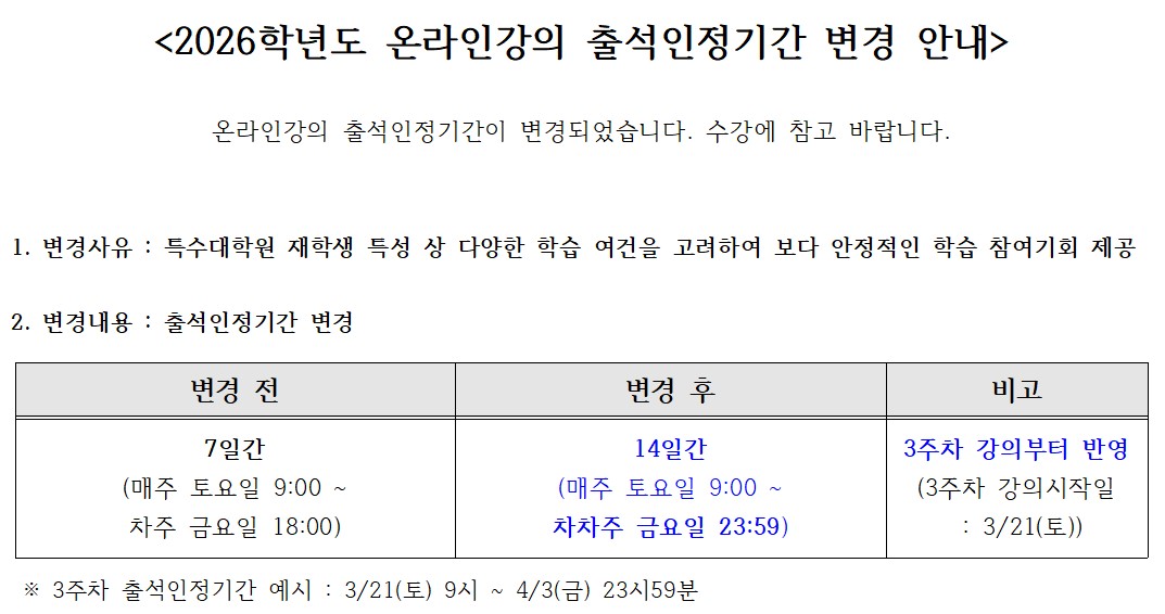 2026학년도 온라인강의 출석인정기간 변경 안내